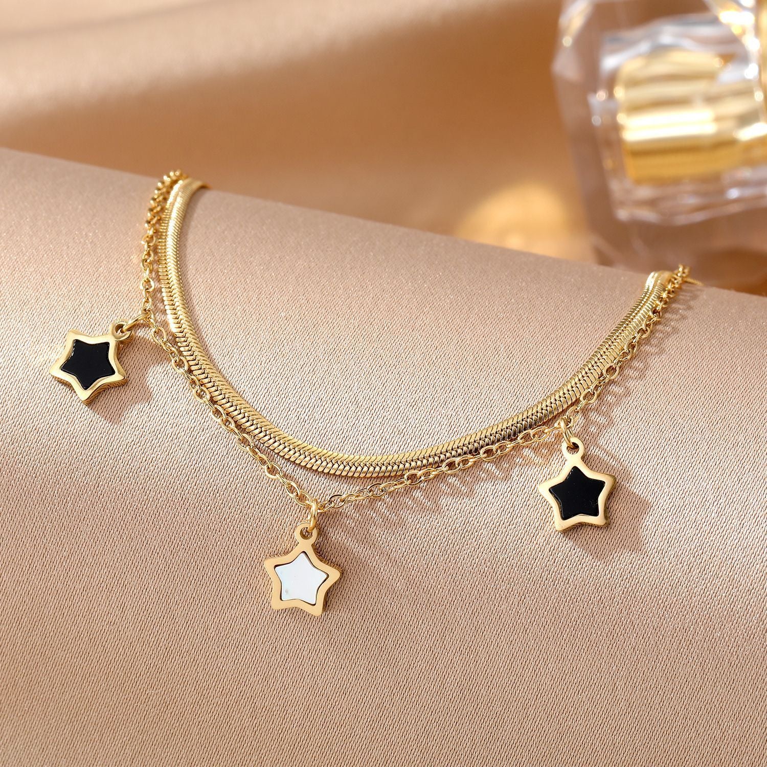 A celestial fusion of elegance and allure, the Stella Noire Bracelet captures the mystique of the night sky with a refined, modern edge. Meticulously crafted from high-grade stainless steel and finished in luminous gold, this double-layered design features a trio of five-pointed stars delicately adorned with glossy black and white enamel, a symbol of balance, cosmic beauty, and individuality.